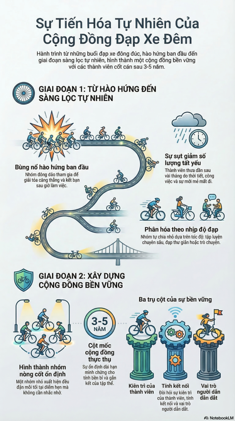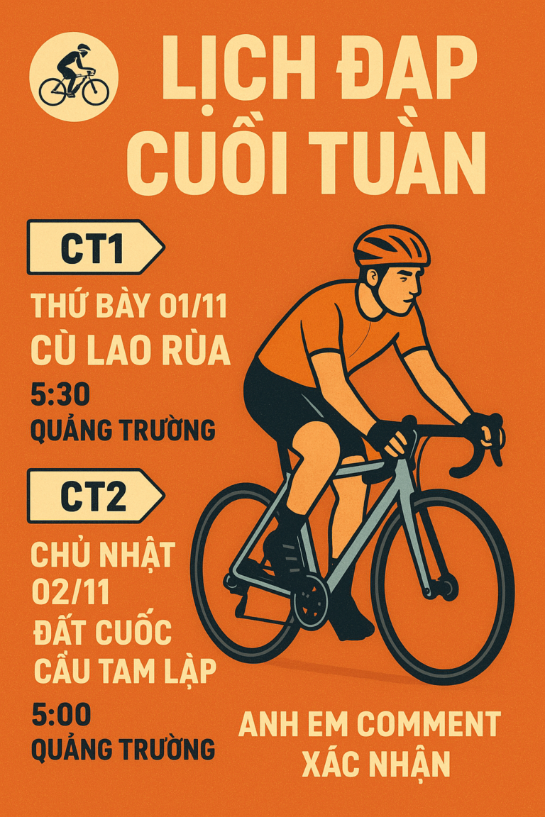 Trong cộng đồng xe đạp thể thao, đặc biệt là các nhóm đạp xe buổi tối, có một hiện tượng khá quen thuộc. Một nhóm mới được lập ra.Buổi tối hẹn nhau ở một điểm quen thuộc — có thể là quảng trường, công viên, hay một đoạn đường vòng hồ. Đến giờ xuất phát,…
