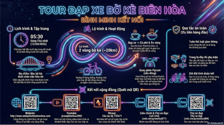 Sáng Chủ nhật, ngày 12/04/2026 Tập trung: lúc 5g30 sáng Địa điểm: Đầu bờ kè, dưới chân cầu Hóa An Anh chị em thân mến,Hội tổ chức tour đạp xe nhẹ buổi sáng tại khu vực bờ kè Biên Hòa, với mục tiêu vận động vừa phải, thư giãn và tận hưởng không khí trong lành của buổi…